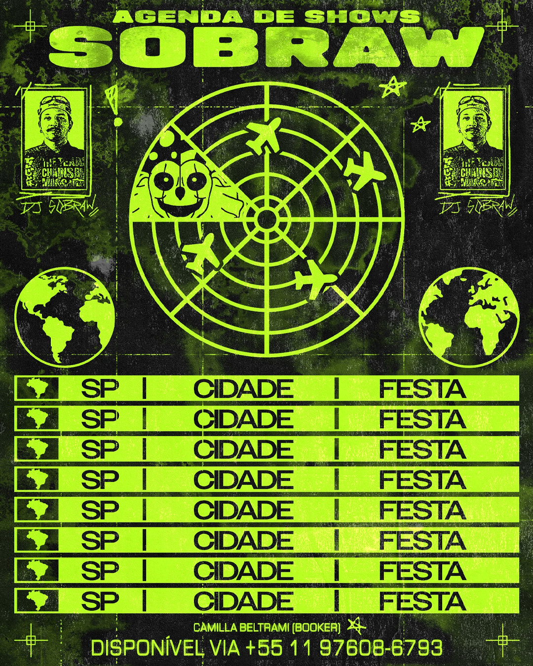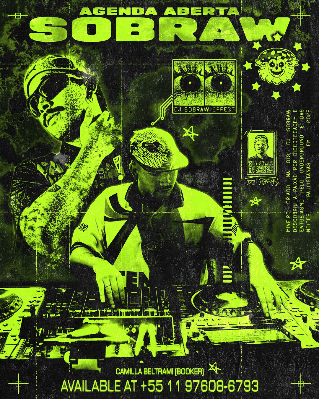 Artes criadas para serem utilizadas como identidade visual do DJ Sobraw – agenda de shows, logotipo e arte de open bookings.